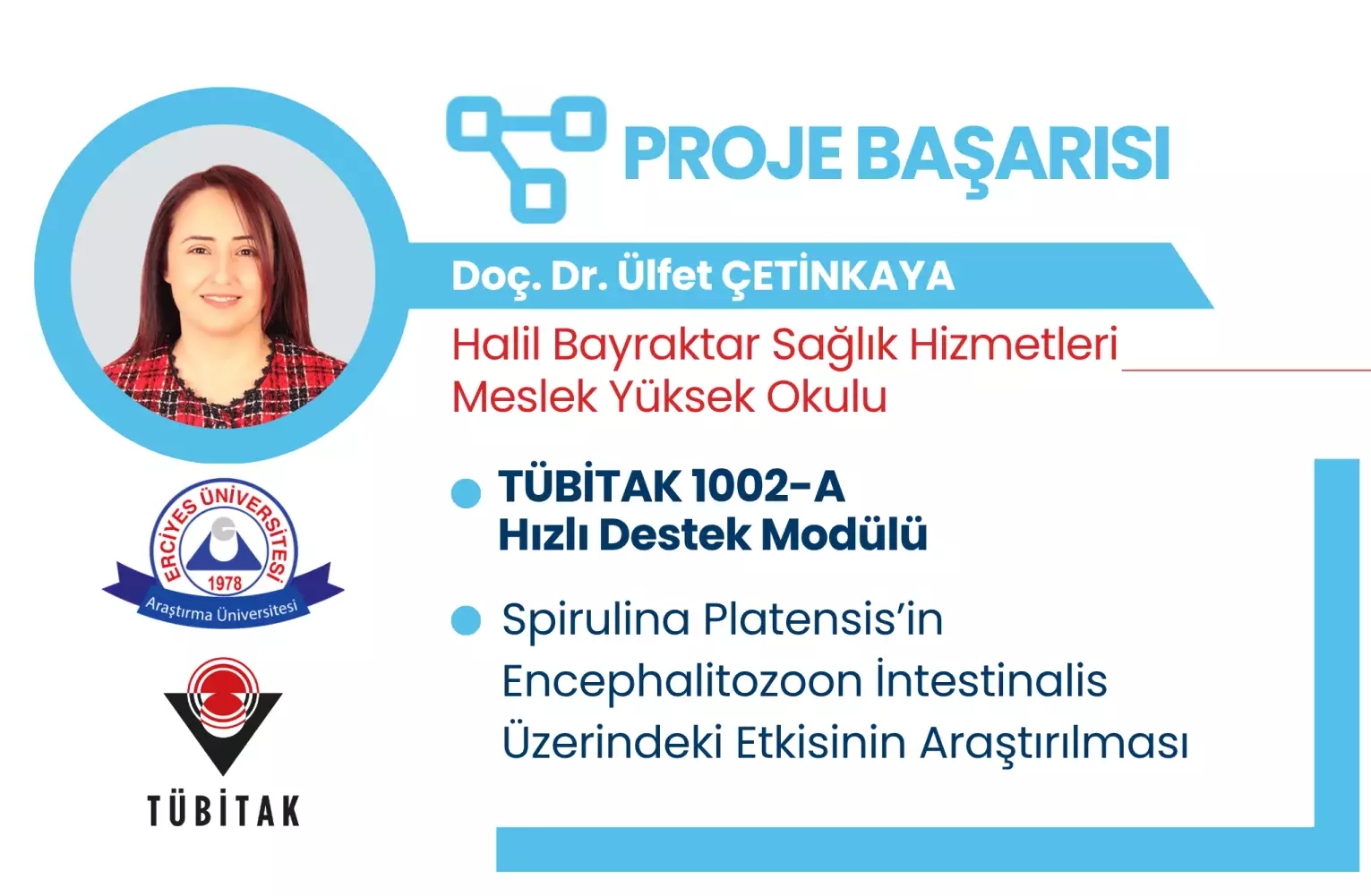 Üniversitemiz Halil Bayraktar Sağlık Hizmetleri Meslek Yüksekokulu öğretim üyesi Doç. Dr. Ülfet ÇETİNKAYA'nın yürütücü; üniversitemiz Fen Fakültesi Biyoloji Bölümü öğretim üyesi Prof. Dr. Fatih DUMAN ve Tıp Fakültesi Tıbbi Farmakoloji Bölümü öğretim üyesi Doç. Dr. Gülay SEZER'in araştırmacı olduğu “Spirulina Platensisin Encephalitozoon İntestinalis Üzerindeki Etkisinin Araştırılması” başlıklı proje TÜBİTAK 1002-A Hızlı Destek Programı kapsamında desteklenmeye hak kazanmıştır.