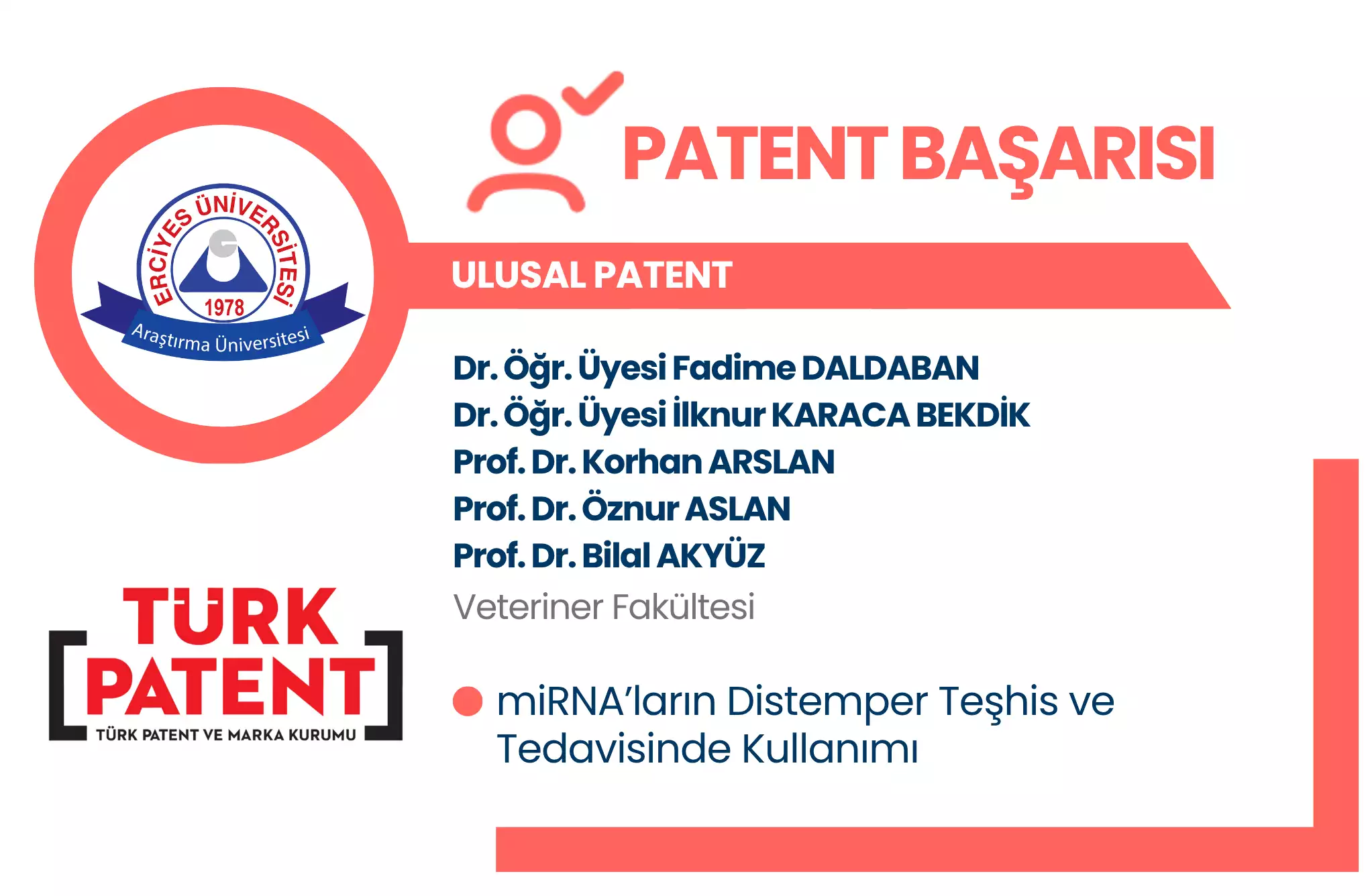 Üniversitemiz Veteriner Fakültesi öğretim üyeleri Dr. Öğr. Üyesi Fadime DALDABAN, Dr. Öğr. Üyesi İlknur KARACA BEKDİK, Prof. Dr. Korhan ARSLAN, Prof. Dr. Öznur ASLAN ve Prof. Dr. Bilal AKYÜZ tarafından geliştirilen "miRNA’ların Distemper Teşhis ve Tedavisinde Kullanımı" başlıklı ulusal patent Türk Patent ve Marka Kurumu tarafından tescil edilmiştir.