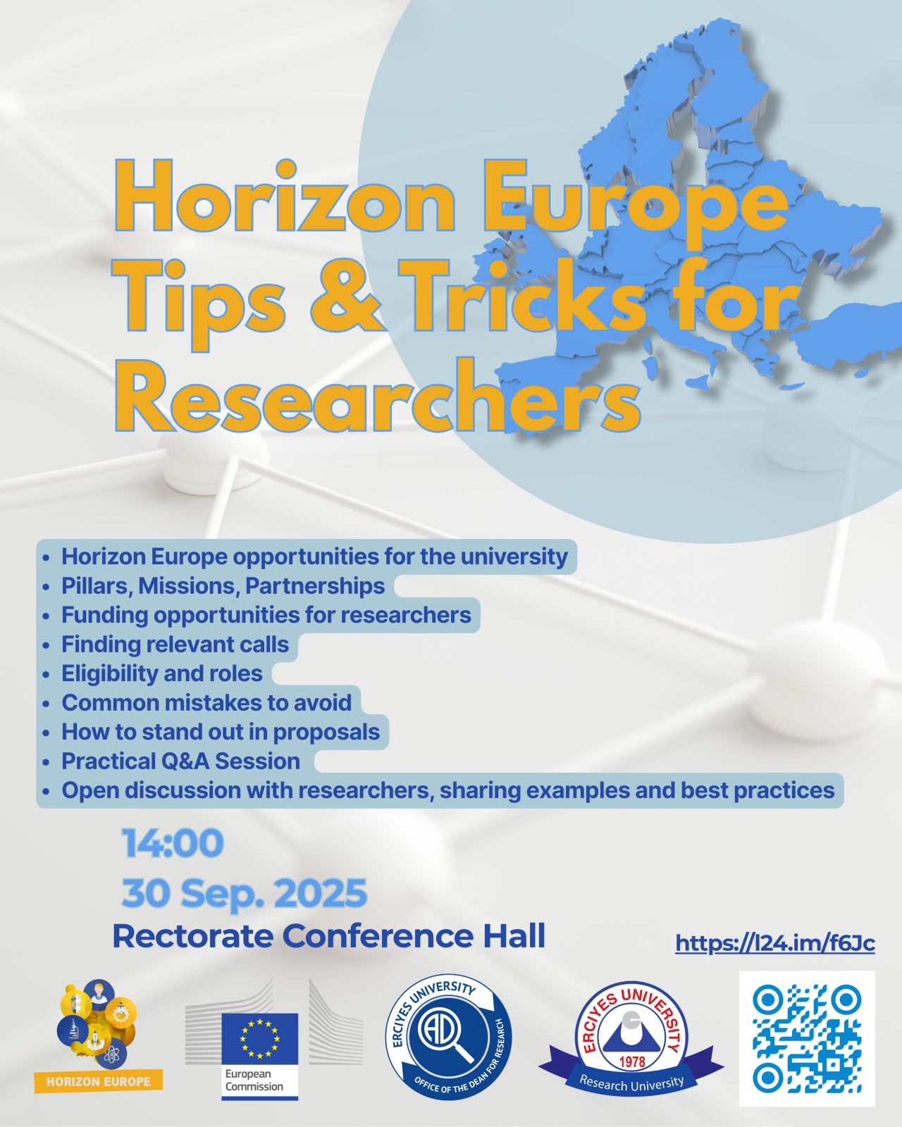Erciyes Üniversitesi Araştırma Dekanlığı tarafından düzenlenen "Horizon Europe Tips & Tricks for Researchers" başlıklı eğitim, 30 Eylül 2025 Salı günü 14.00-16.00 saatleri arasında Rektörlük Konferans Salonunda gerçekleştirilecektir.