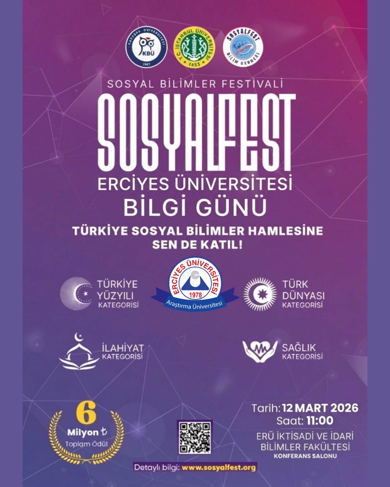 Bilimsel faaliyetlere ilgi duyan ve yenilikçi çözümler üretmek isteyen tüm öğrenci ve akademisyenlerimizi, 12 Mart 2026 saat 11.00'de ERÜ İktisadi ve İdari Bilimler Fakültesi Konferans Salonunda düzenlenecek "Sosyalfest 2026 Erciyes Üniversitesi Bilgi Günü" toplantısına bekliyoruz.