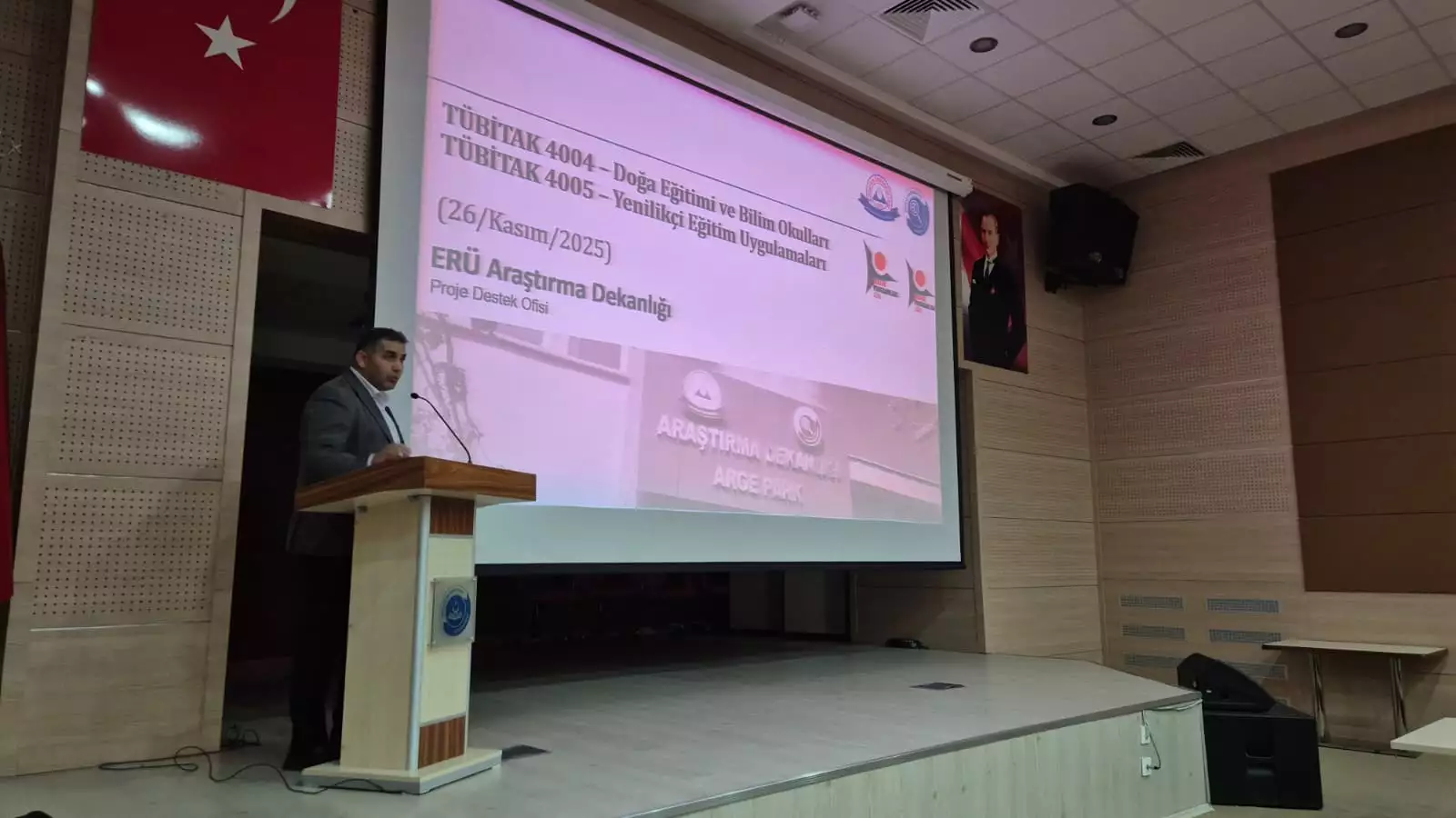 Araştırma Dekanlığı Proje Destek Ofisi tarafından düzenlenen TÜBİTAK 4004 – Doğa Eğitimi ve Bilim Okulları Programı ile TÜBİTAK 4005 – Bilim ve Toplum Yenilikçi Eğitim Uygulamaları Programına yönelik bilgilendirme toplantısı, Eğitim Fakültesi Konferans Salonu’nda akademisyen ve öğrencilerin katılımıyla gerçekleştirildi.
